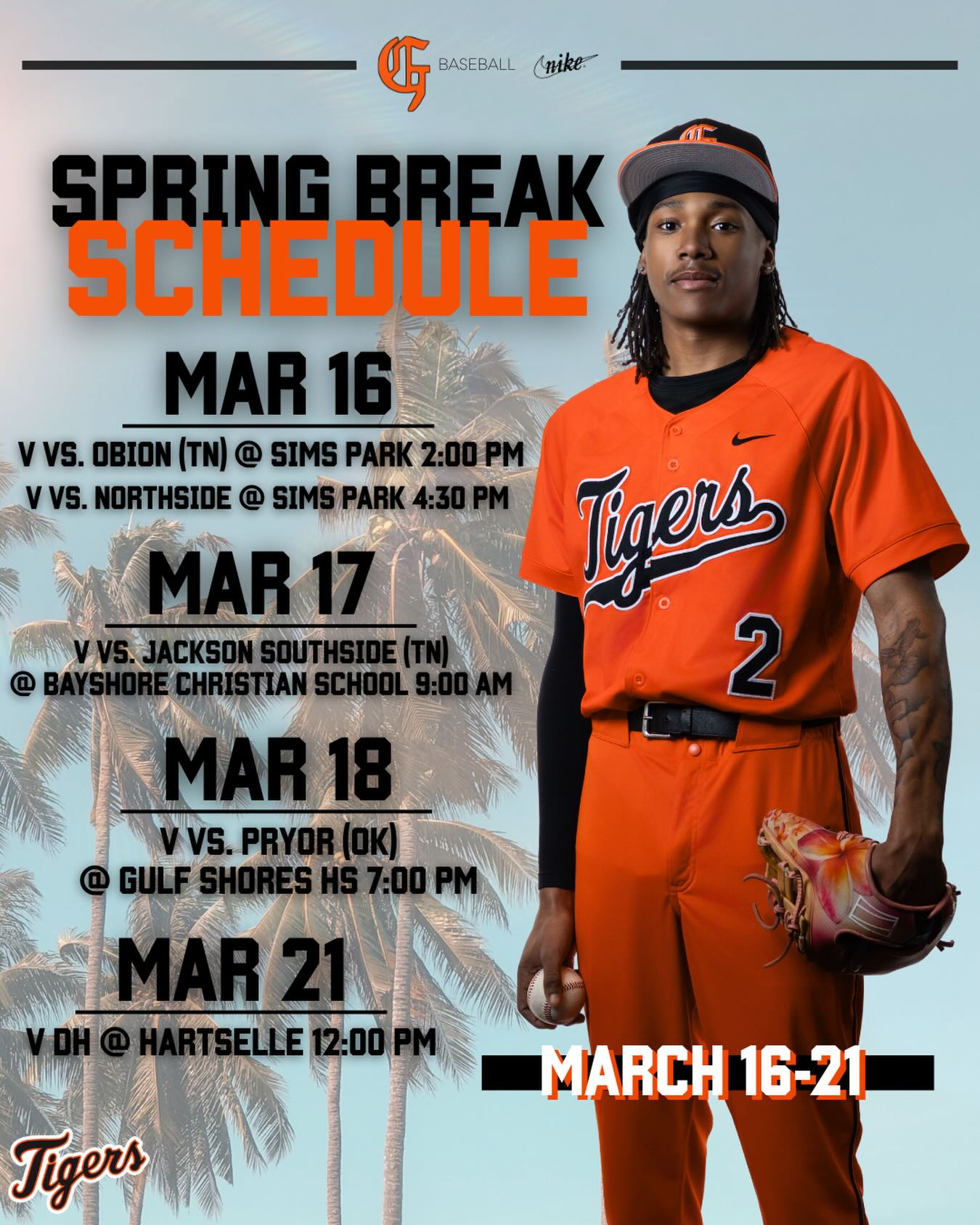 Spring break week is here! The Tigers will be headed to Gulf Shores for the first half of the week and Hartselle at the end of the week!