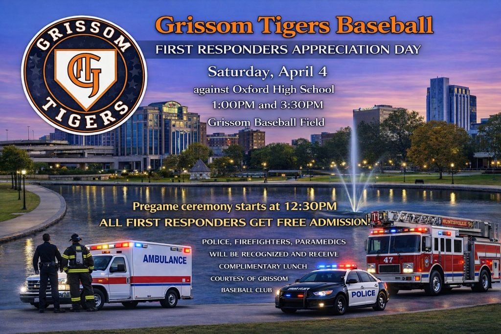 Friends of Grissom Baseball – Save the Date! Grissom Baseball will be holding First Responders Appreciation Day on Saturday, April 4th during the varsity doubleheader against Oxford High School. Whether it’s a firefighter rushing into danger, a police officer protecting our neighborhoods, or an EMT providing life-saving care, their commitment, courage, and selflessness do not go unnoticed. They work long hours, make personal sacrifices, and carry a responsibility that most of us will never fully understand. Yet they show up—day in and day out—to keep our families safe and our community strong. Pre-game ceremonies start at 12:30 with the first pitch at 1:00. All first responders get in free and will receive a complimentary lunch. Please help us share this on social media and other community bulletins.