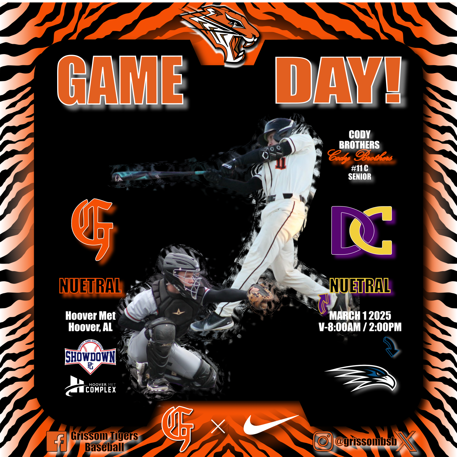 Game Day Mar 1, 2025 by Jeremy Davis · March 1, 2025 Game DayVarsity -8:00AM at Mtn Brook HS (DeSoto Central)Varsity -2:00PM at Hoover Met (Florence)Perfect Game USA High School Showdown Share