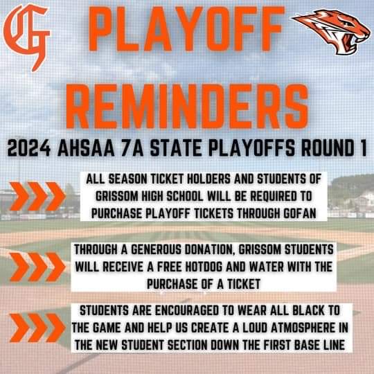 IT’S PLAYOFF TIME IN SOUTH HUNTSVILLE 🆚 James Clemens Jets 🛩️ ⌚️Friday, April 26th at 4:30 and 7:00 ⌚️Saturday, April 27th at 1:00 (If Needed) 🏟️G-BLOCK ➡️2024 7A State Playoffs: Round 1 🚨STUDENTS WEAR...
